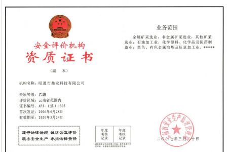 2003年11月10日,昭通市鼎安科技有限公司成立,初始主要從事第三方安全工程技術(shù)服務(wù),經(jīng)多年運(yùn)營,發(fā)展為多專業(yè)綜合科技平臺,為社會(huì)提供多種專業(yè)技術(shù)服務(wù)工作。 現(xiàn)公司注冊資金為1200萬元,公司法定代表人:毛衛(wèi)旭。公司主要業(yè)務(wù):安全評價(jià)、安全標(biāo)準(zhǔn)化評審、安全工程技術(shù)服務(wù);環(huán)境監(jiān)測、職業(yè)衛(wèi)生檢測、檢驗(yàn);法律訴訟及非訴訟服務(wù);司法鑒定、固定資產(chǎn)投資項(xiàng)目節(jié)能服務(wù);工程咨詢;工程測量測繪;安全教育培訓(xùn)等。是安全生產(chǎn)服務(wù)、安全教育培訓(xùn)機(jī)構(gòu),也是環(huán)境監(jiān)測和職業(yè)衛(wèi)生服務(wù)機(jī)構(gòu),同時(shí)也是綜合的檢測檢驗(yàn)、綜合科技平臺服務(wù)機(jī)構(gòu)。多年來為公、檢、法、司、軍、警、海關(guān)、仲裁、安監(jiān)、工礦商貿(mào)企業(yè)、社會(huì)團(tuán)體及個(gè)人提供多專業(yè)技術(shù)服務(wù)。